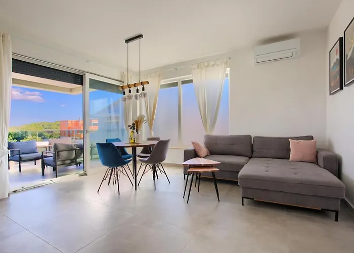 Apartmán Modern Two Bedroom Apartment 'Sky View' In Stinjan nabízí kompletní kuchyni i pokoje s psacím stolem, místností na posezení a satelitním TV. Ubytování je 3 km od Pevnost v Pule, zatímco Komunální palác je 3,1 km daleko.